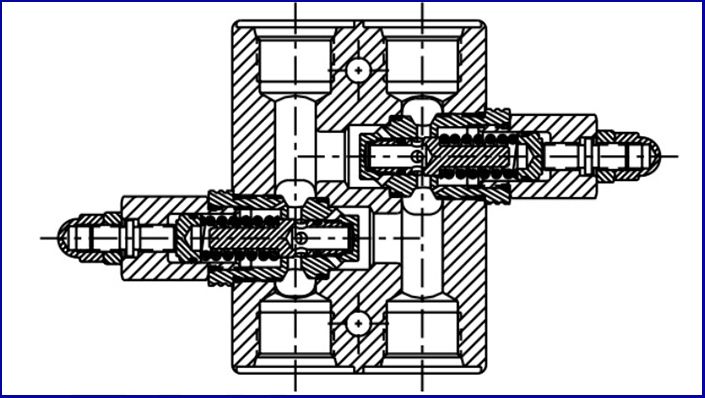 Khối bao gồm 2 bộ điều khiển lưu lượng được kết nối theo kiểu bố trí đồng hồ đo và hai van kiểm tra rẽ nhánh. Khi một trong hai van điều tiết được cung cấp năng lượng, áp suất của van điều khiển được chuyển qua một trong các van kiểm tra bên trong và đến một bên của ống đệm chính.